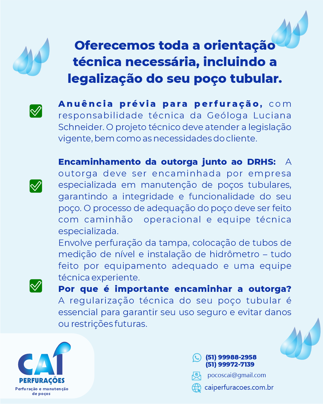 Anuência prévia para perfuração, com responsabilidade técnica da Geóloga Luciana Schneider. O projeto técnico deve atender a legislação vigente, bem como as necessidades do cliente.
